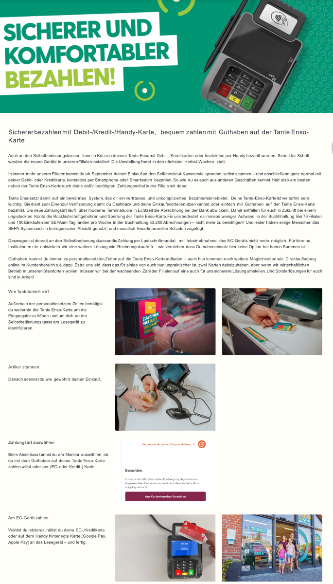 Sicherer bezahlen mit Debit-/Kredit-/Handy-Karte, bequem zahlen mit Guthaben auf der Tante Enso-Karte.
